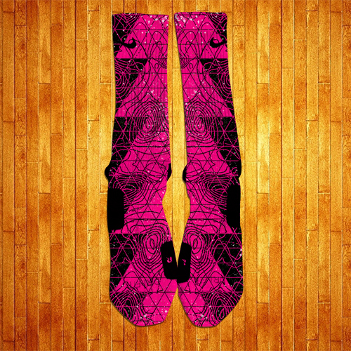 Inspired by the KDVI Meteorologys, these socks sport a Black and Pink colorway accented with White splatters and a Black and Pink storm watch grid appropriate for the storm Kevin Durant brings when he laces these up and steps on the court.