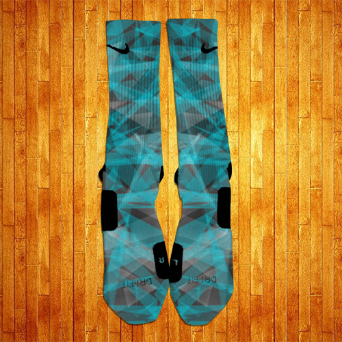 Inspired by the Lebron XI Gamma Blue, these socks sport a Grey and Gamma Blue prism style design accented with Grey Splatters.