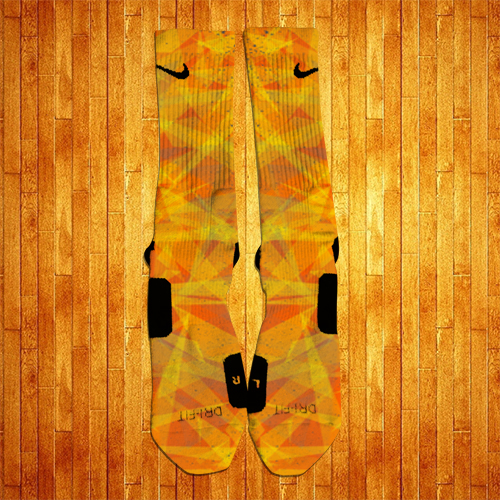 Inspired by the Lebron XI Forging Irons, these socks sport a Orange and Yellow prism style design accented with Grey Splatters.