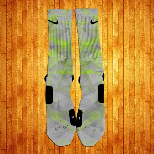 Inspired by the Lebron XI Dunkmans, these socks sport a Light Grey, Dark Grey and Lime prism style design accented with Dark Grey Splatters.