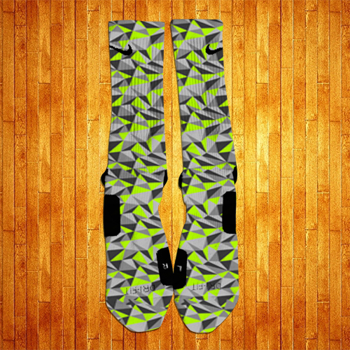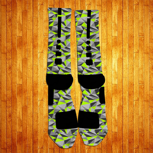 Inspired by the Nike Air Max 90 Ice, these socks rock a diamond graphic featuring different shades of Grey and Lime Green.